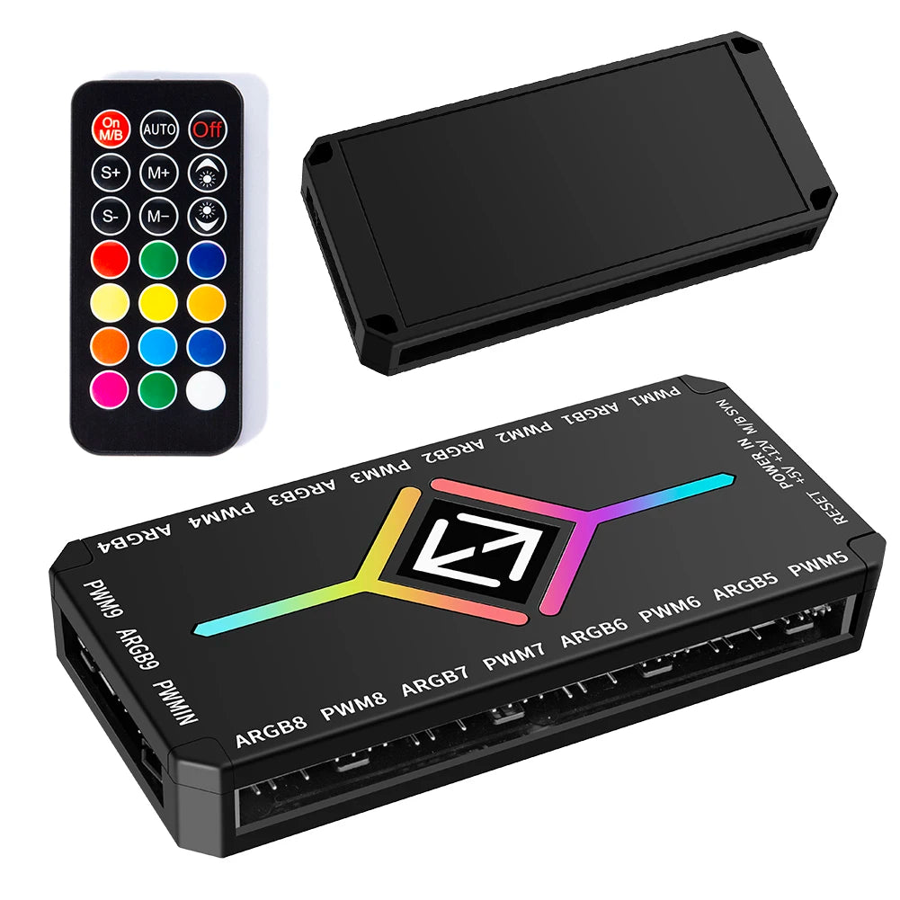 1 To 9 Ports 3 in 1 5V 3 Pin ARGB Controller Cooling Fan Hub with Remote 4 Pin PWM Magnetic Suction Hub SATA Power Supply PWM Magnetic Fan Hub Splitter for 5V Addressable ARGB Computer PC Case Fan