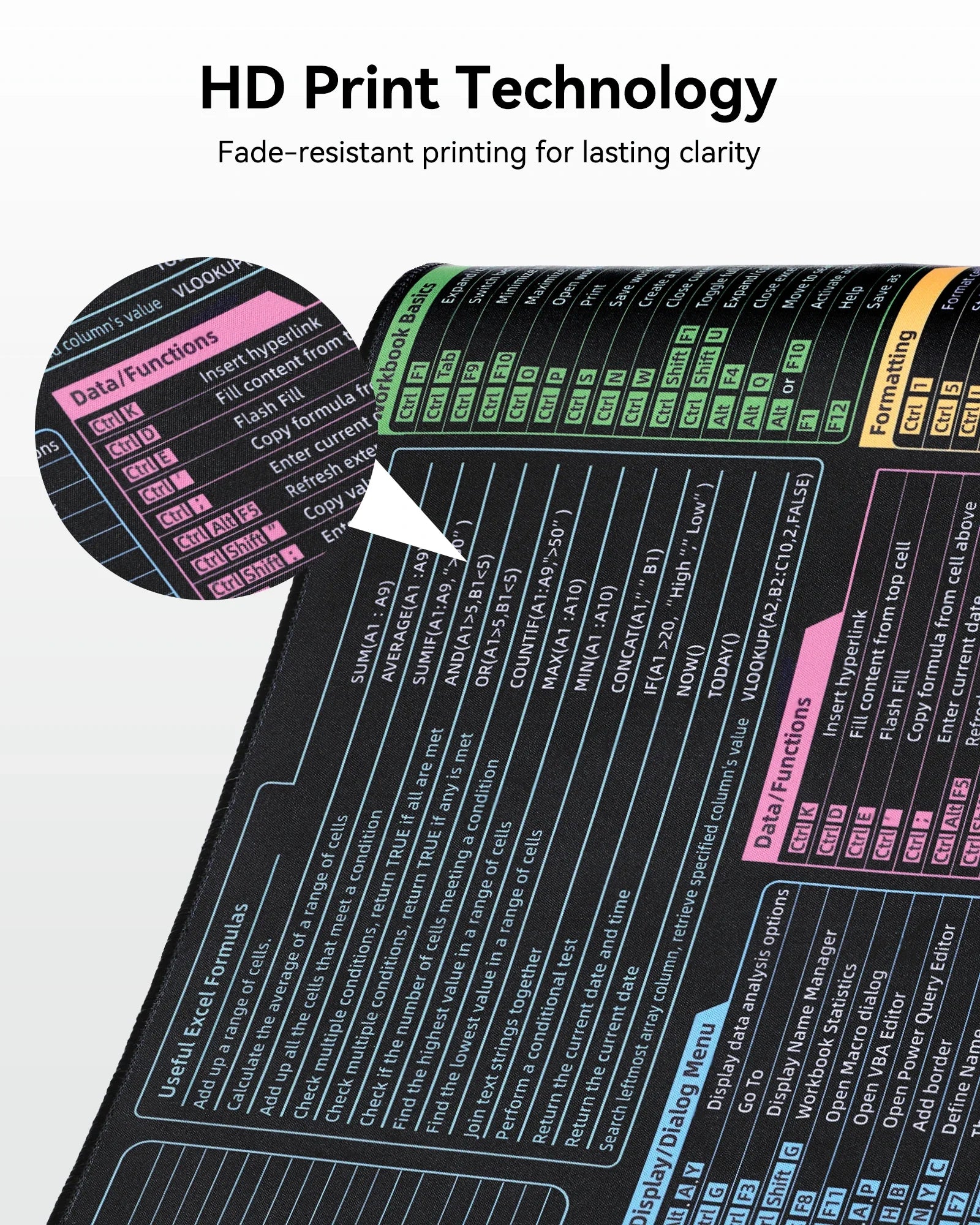 Large and comfortable size:This Excel cheat sheet desk pad has XL large size: Enough to provide a great space for your mouse and keyboard.It is definitely your best choice for office, study and gameing.